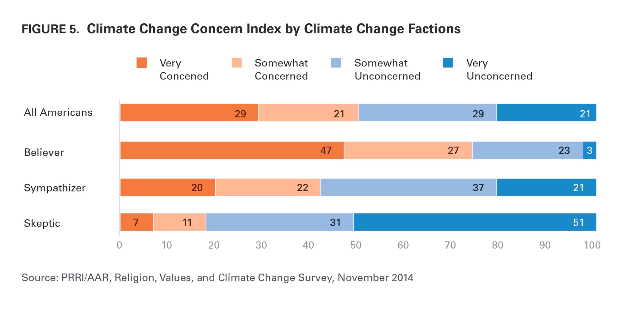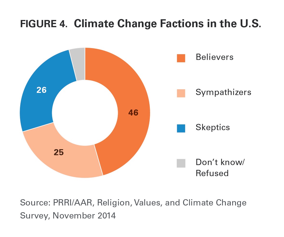 The PRRI survey developed three categories of attitudes about climate change: believers (who think it is happening), sympathizes (who agree it is a thing but not very concerned), and skeptics (who doubt CC is an actual thing). Luckily, the largest group is the “believers.” Unfortunately, less than half the USA population fits in this category.