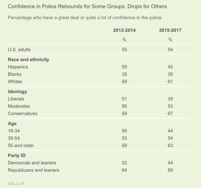 Confidence among conservatives has increased since 2015. Basically when confidence was dropping nationally because the reports of abuse were being documented in film, conservatives decided that shooting unarmed black people is what police should be doing.