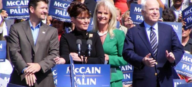 Image: Left to right: Todd Palin, Sarah Palin, Cindy McCain, and John McCain. Rally in Fairfax, Virginia on September 10, 2008. Photo by Rachael Dickson. CC license Wikimedia Commons